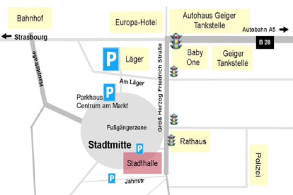 Die besten Parkmöglichkeiten finden Sie am Läger oder im Parkhaus Centrum am Markt. Von dort aus sind sie in ca. 5 Minuten zu Fuß an der Stadthalle.